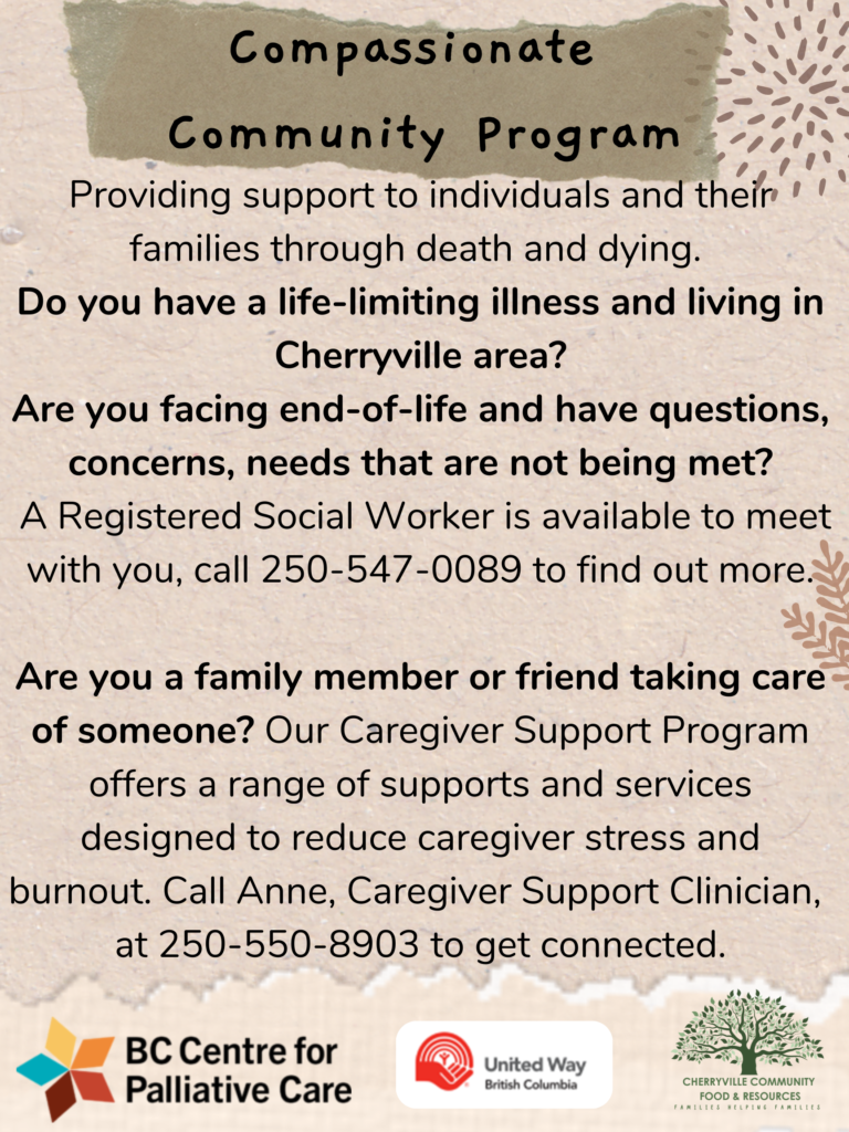 Compassionate Communities – if you or someone you know is living with life-limited illness and/or facing end-of-life, we want to support you throughout your health journey. We are excited to extend our supports and services to caregivers in the Cherryville and Lumby area. Caregiving can be an incredibly rewarding role however there are many challenges that come along with it. If you are caregiving for a friend, loved one, neighbor and are looking to get connected with our Caregiver Support Clinician, call us at 250-550-8903 or email caregiversupport@ccfrs.ca. We have a range of supports and services specifically designed to support caregivers in their role, to alleviate stress and reduce caregiver burnout. We want to hear from you!