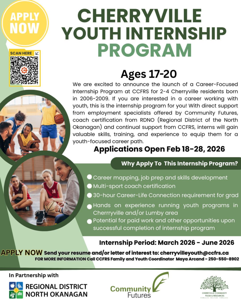 The above programs are managed and implemented by our Youth and Family Coordinator, Maya Arcand. Maya works directly with families, community organizations, and local stakeholders to bridge services and supports into Cherryville area to create opportunities for local kids. There are a number of ways to stay up-to-date on youth activities happening in the Cherryville area, including registration details. Follow our Youth and Family Facebook page at Cherryville Youth and Family Resources, subscribe to our monthly newsletter, drop in to the Resource Center anytime between 8:00-3:00 Monday-Thursday or contact Maya Arcand directly (Ph: 250-550-8902 Email: cherryvilleyouth@ccfrs.ca).